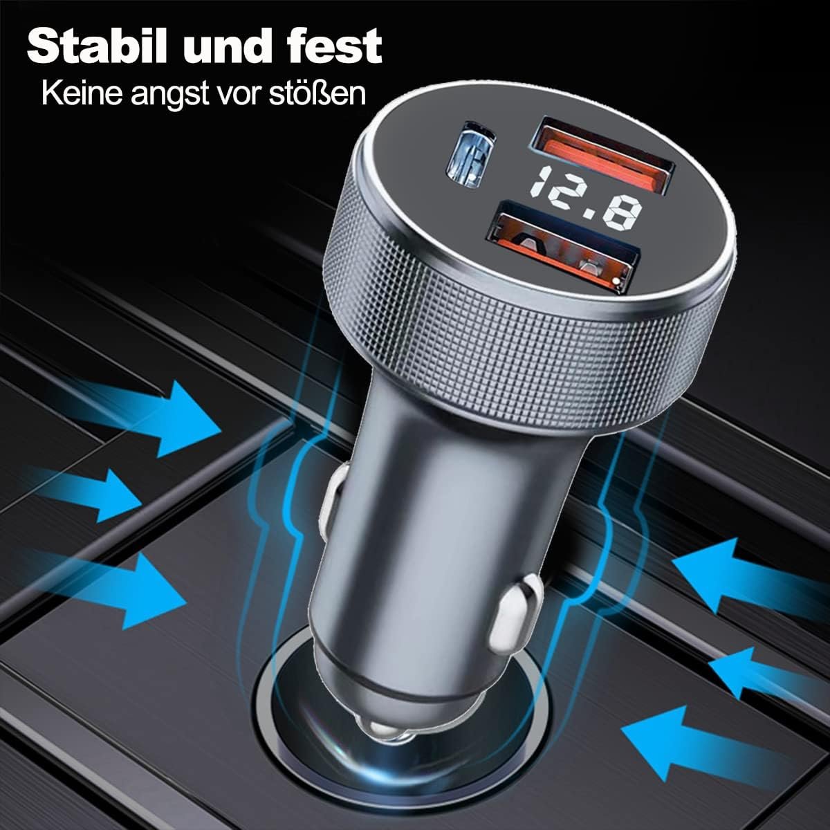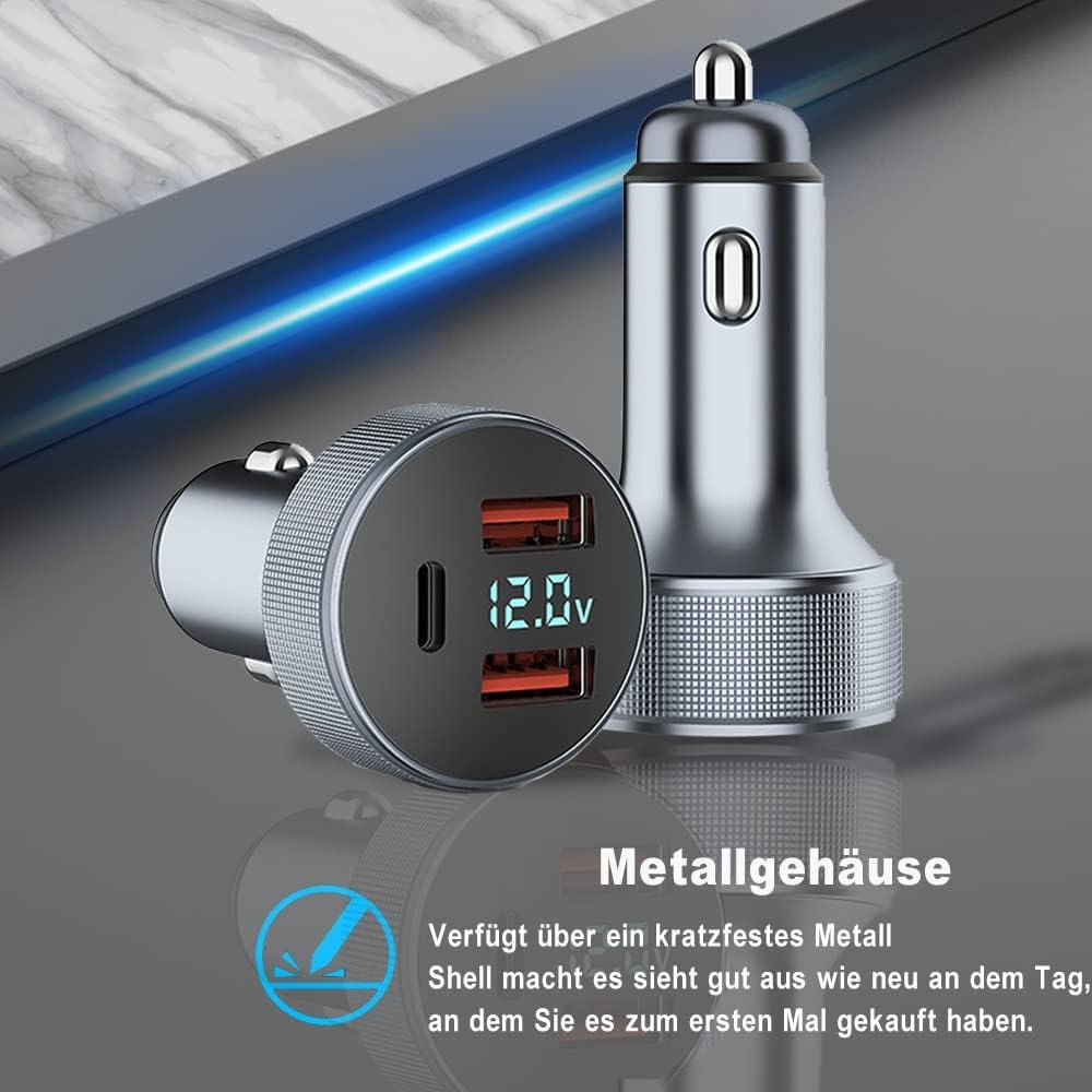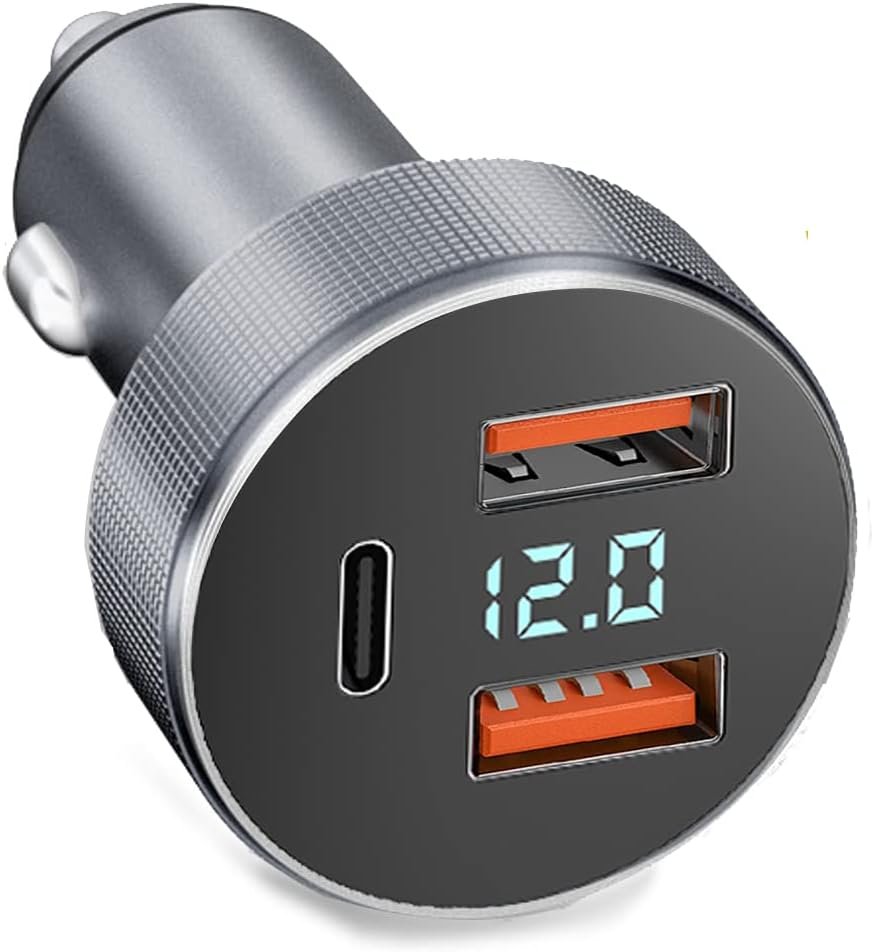Cargador de mechero con 3 puertos de carga rápida y pantalla LED de voltaje.