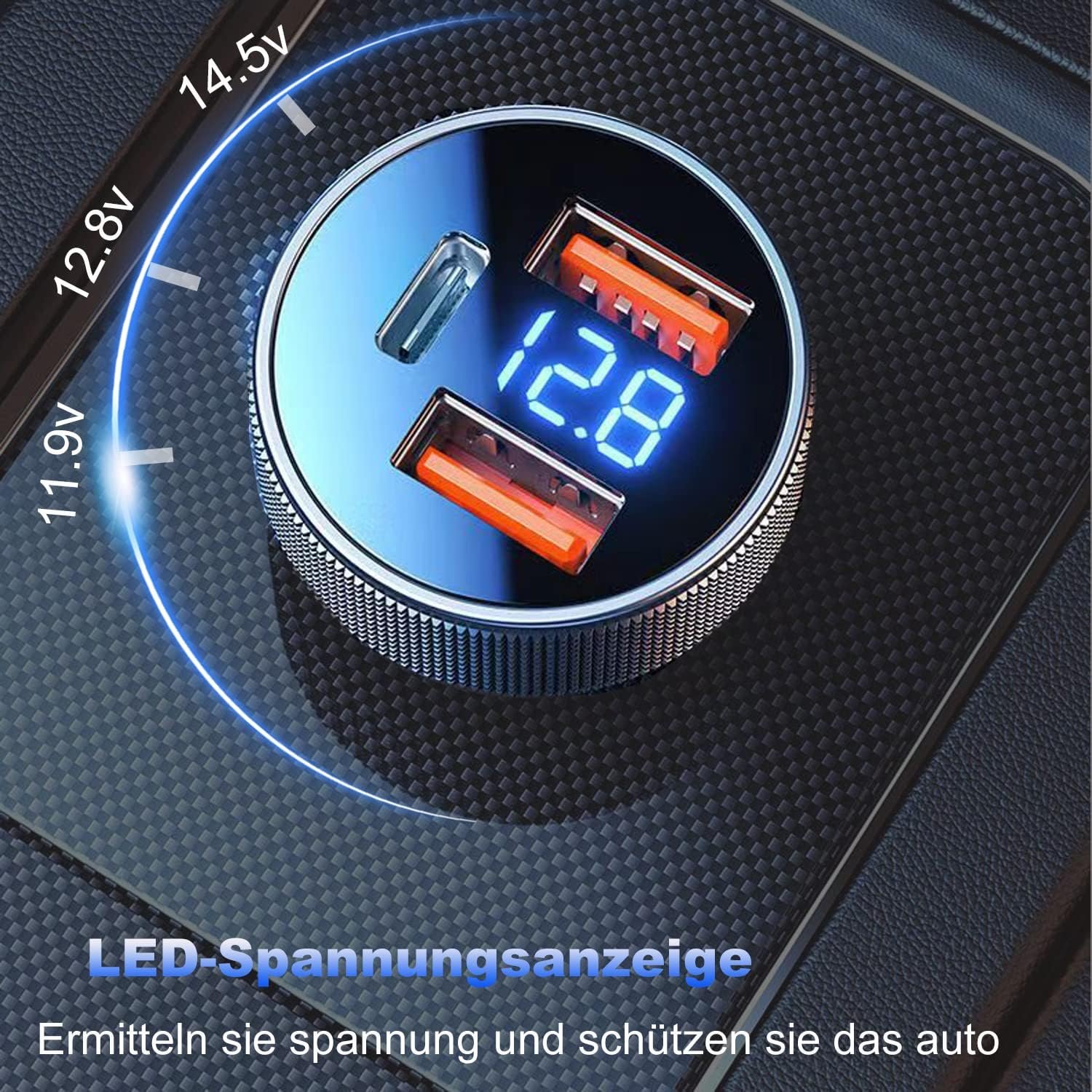 Cargador de mechero con 3 puertos de carga rápida y pantalla LED de voltaje. Carga varios dispositivos a la vez.